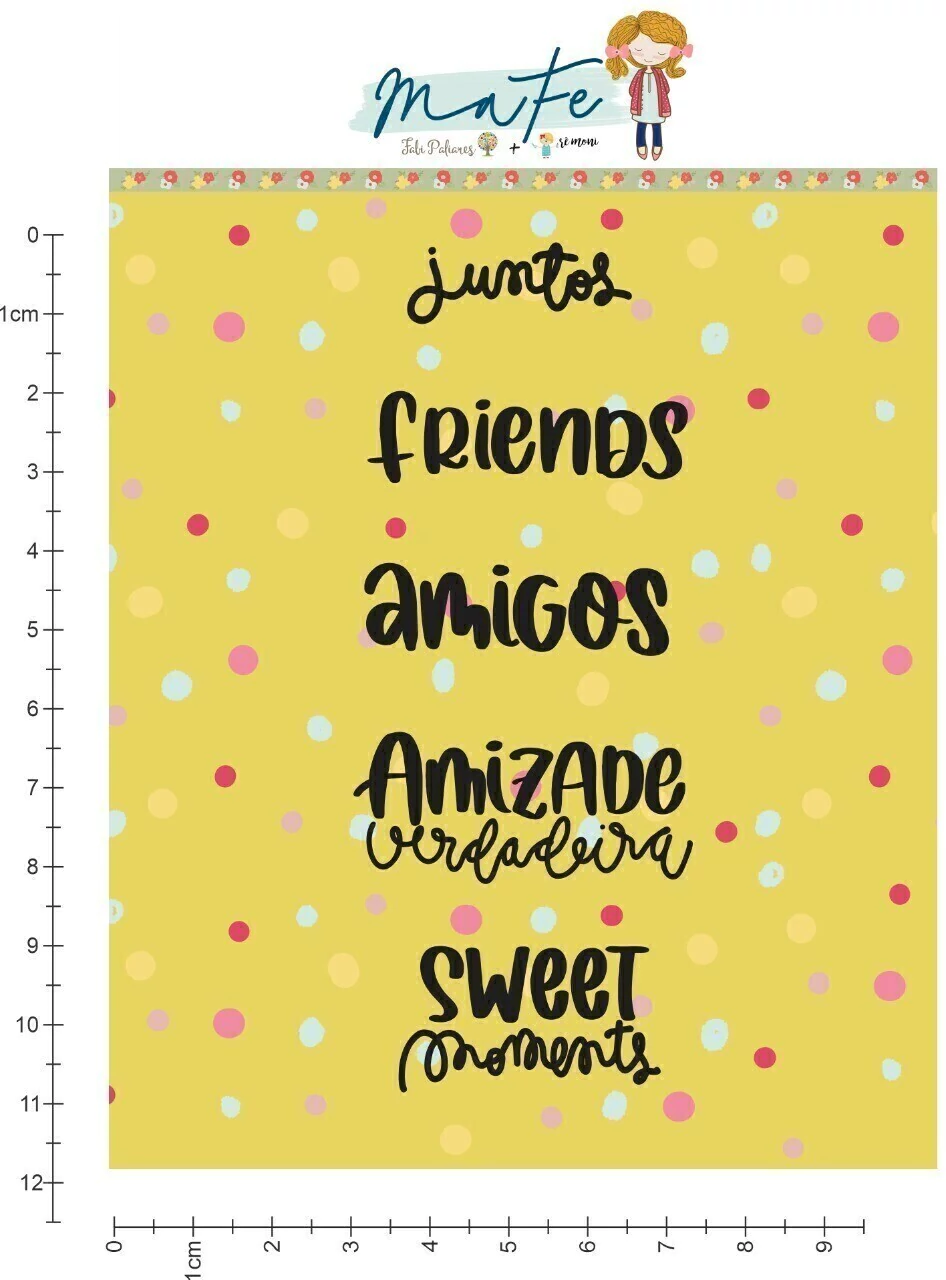 - cartela de carimbo de silicone compalavras e frases da Coleção MaFe: " juntos", "friends", "amigos", "amizadde verdadeira"e "sweet moments"